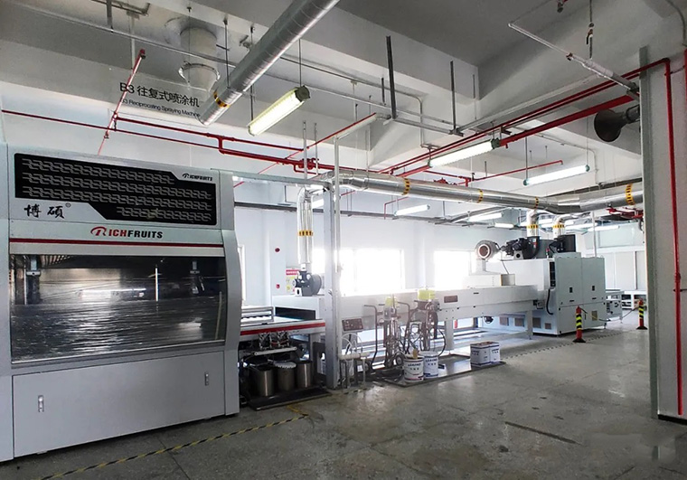 素材→UV往復式噴涂開放底漆(50-60g/㎡)→UV固化→輕砂→UV往復式噴涂透明底漆(60-80g/㎡)→UV固化→砂光→UV往復式噴涂透明面漆(60-80g/㎡)→UV固化