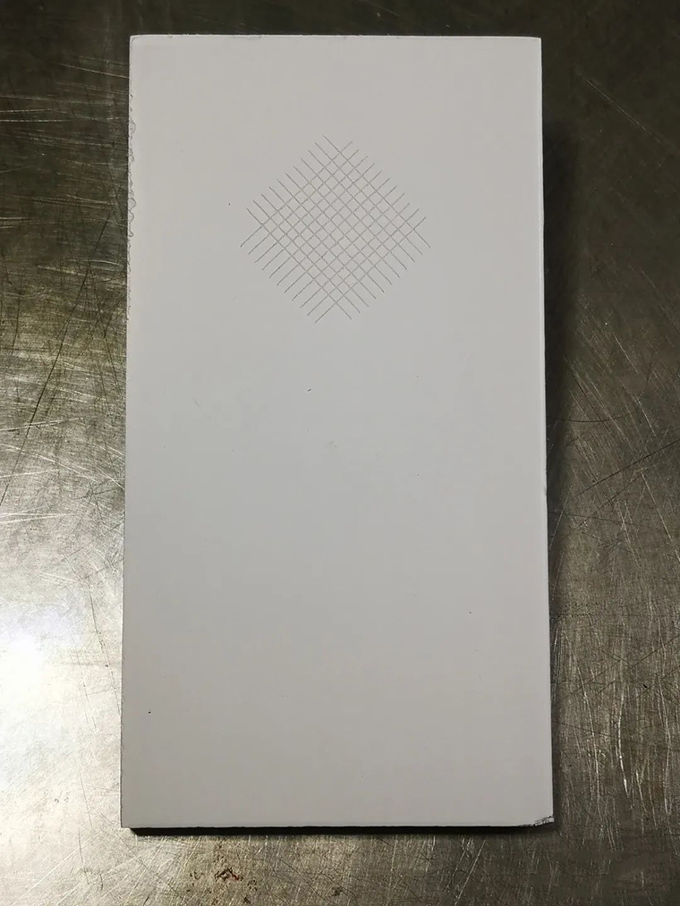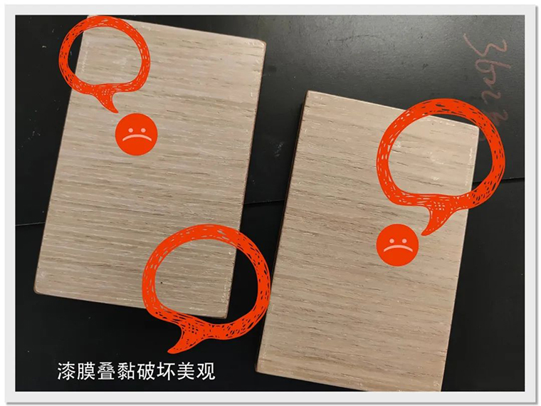 ▲在三聚氰胺板材上直接涂水性白面漆的密著性測試