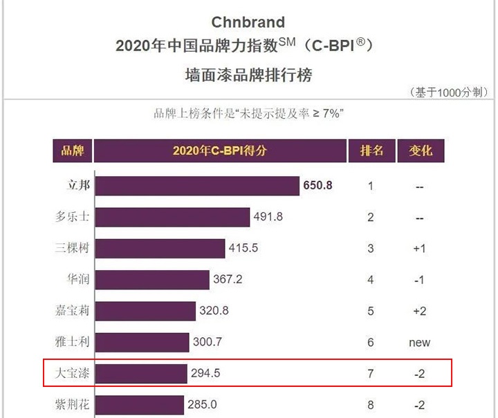 4月22日,中國領(lǐng)先的品牌評級權(quán)威機構(gòu)Chnbrand通過官網(wǎng)發(fā)布了2020年(第十屆)中國品牌力指數(shù)(C-BPI)品牌排名和分析報告。在激烈的品牌力競爭中,大寶漆脫穎而出,再一次登上墻面漆、木器漆兩大品牌力指數(shù)排行榜單。