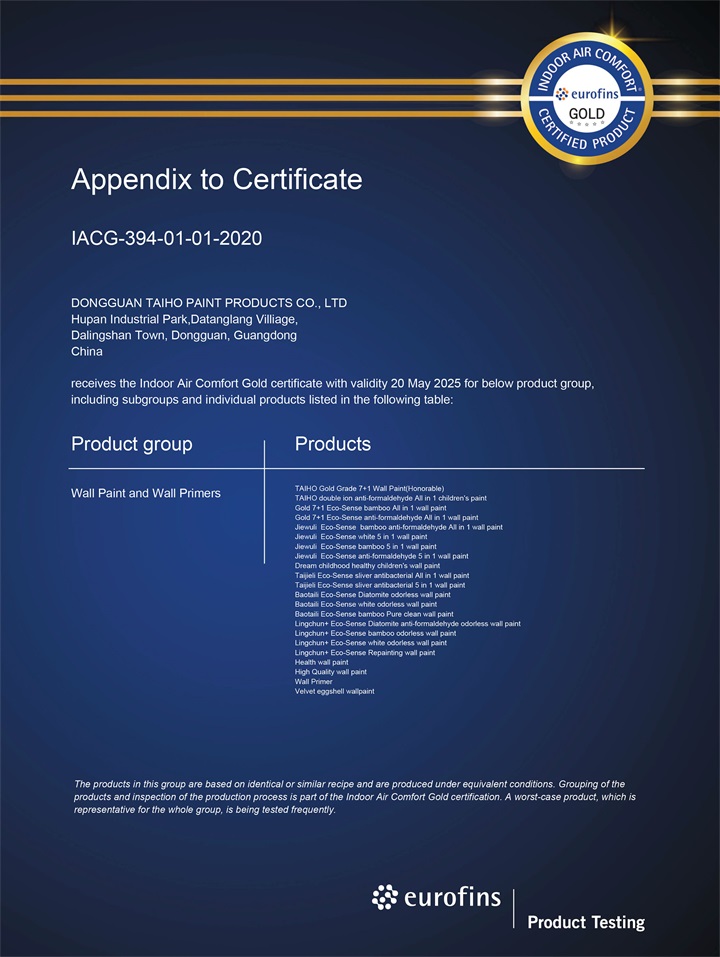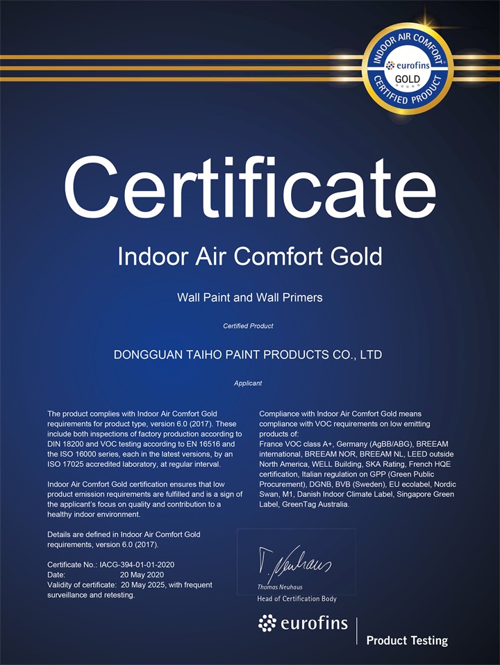 近日,大寶漆22款綠色墻面漆產(chǎn)品通過了歐洲室內(nèi)最嚴(yán)格VOC排放標(biāo)準(zhǔn)的IAC-Gold(Indoor Air Comfort-Gold室內(nèi)空氣質(zhì)量-金級)認(rèn)證,這表示大寶漆產(chǎn)品在環(huán)保性能方面再次贏得了重要國際權(quán)威認(rèn)可。此次通過IAC-Gold認(rèn)證,對大寶漆來說是一種極高的品牌榮譽(yù),表明大寶漆產(chǎn)品性能優(yōu)越,各項(xiàng)指標(biāo)達(dá)到業(yè)界公認(rèn)的嚴(yán)苛的國際標(biāo)準(zhǔn)。