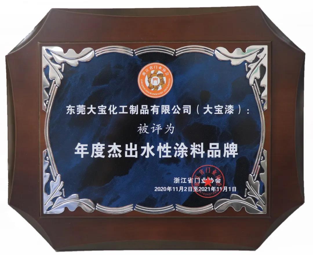 2020第七屆中國門業(yè)定制家居GDCC峰會暨浙江省門業(yè)協(xié)會年會,大寶漆獲得“年度杰出水性涂料品牌”。