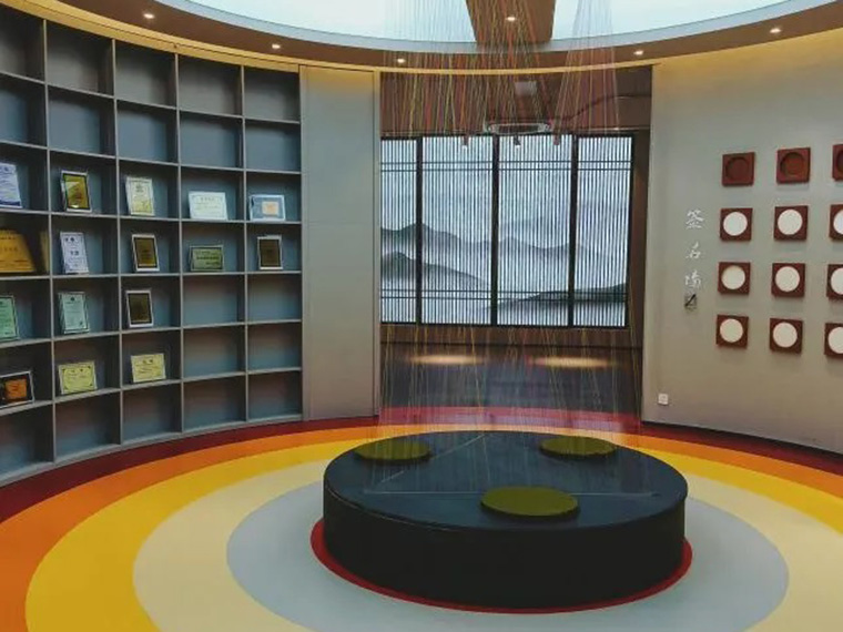 在隔出來的弧形展廳,一面墻展示著企業獲獎榮譽證書,一面墻是客戶的簽名展示區。