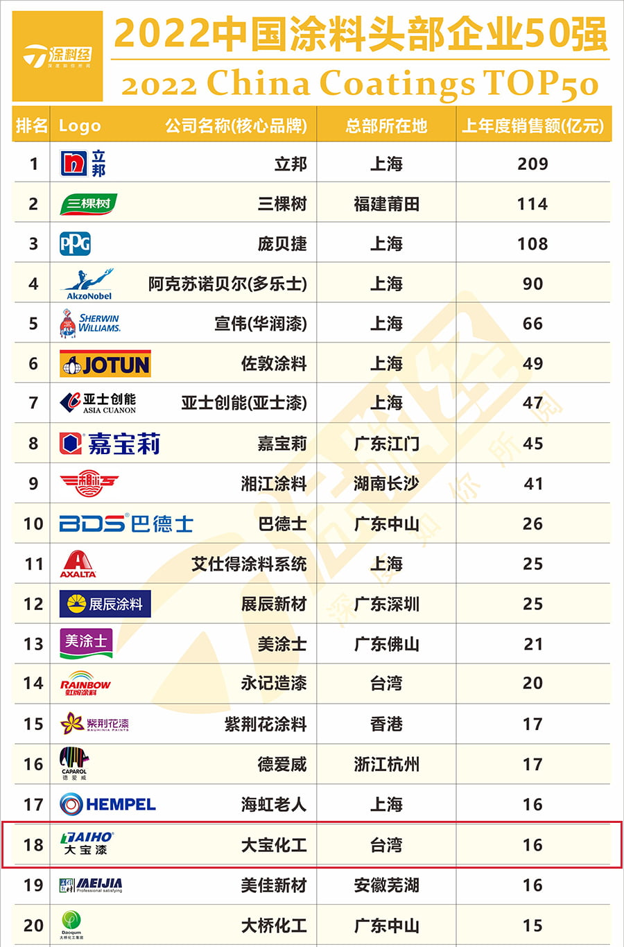“2022中國(guó)民族涂料50強(qiáng)”榜單排名依據(jù)上一年度銷售額, “民族涂料”,是指發(fā)源地為中國(guó)(包括港澳臺(tái))、不涉及外資(港澳臺(tái)資本除外)的涂料企業(yè),且只選取其上一年在中國(guó)市場(chǎng)(包括港澳臺(tái))的銷售數(shù)據(jù)作為排行依據(jù)。