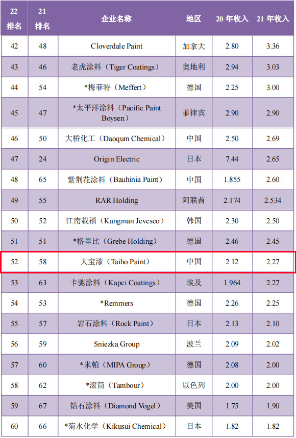 2022全球涂料制造企業排行榜(大寶漆位列52名)