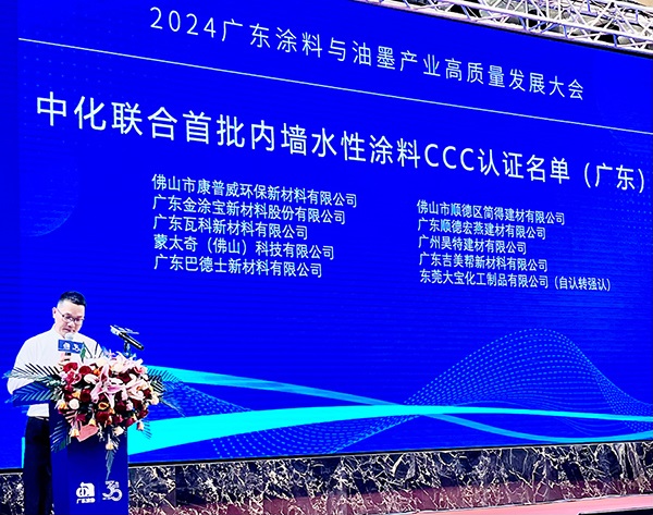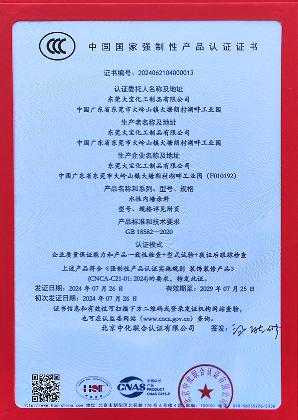 東莞大寶化工率先申請水性內墻涂料CCC認證,順利通過嚴格審核與評估,獲得行業首批水性內墻涂料CCC認證證書。